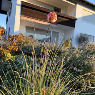 Wege, Sitzbereiche und geschmackvolle Einfassungen wurden so arrangiert, dass ein natürlicher Fluss entsteht und der Garten intuitiv genutzt werden kann. Durch die Kombination von kräftigen Farben, weichen Formen und liebevollen Details entstand ein Ort, der zum Entspannen, Genießen und Verweilen einlädt.